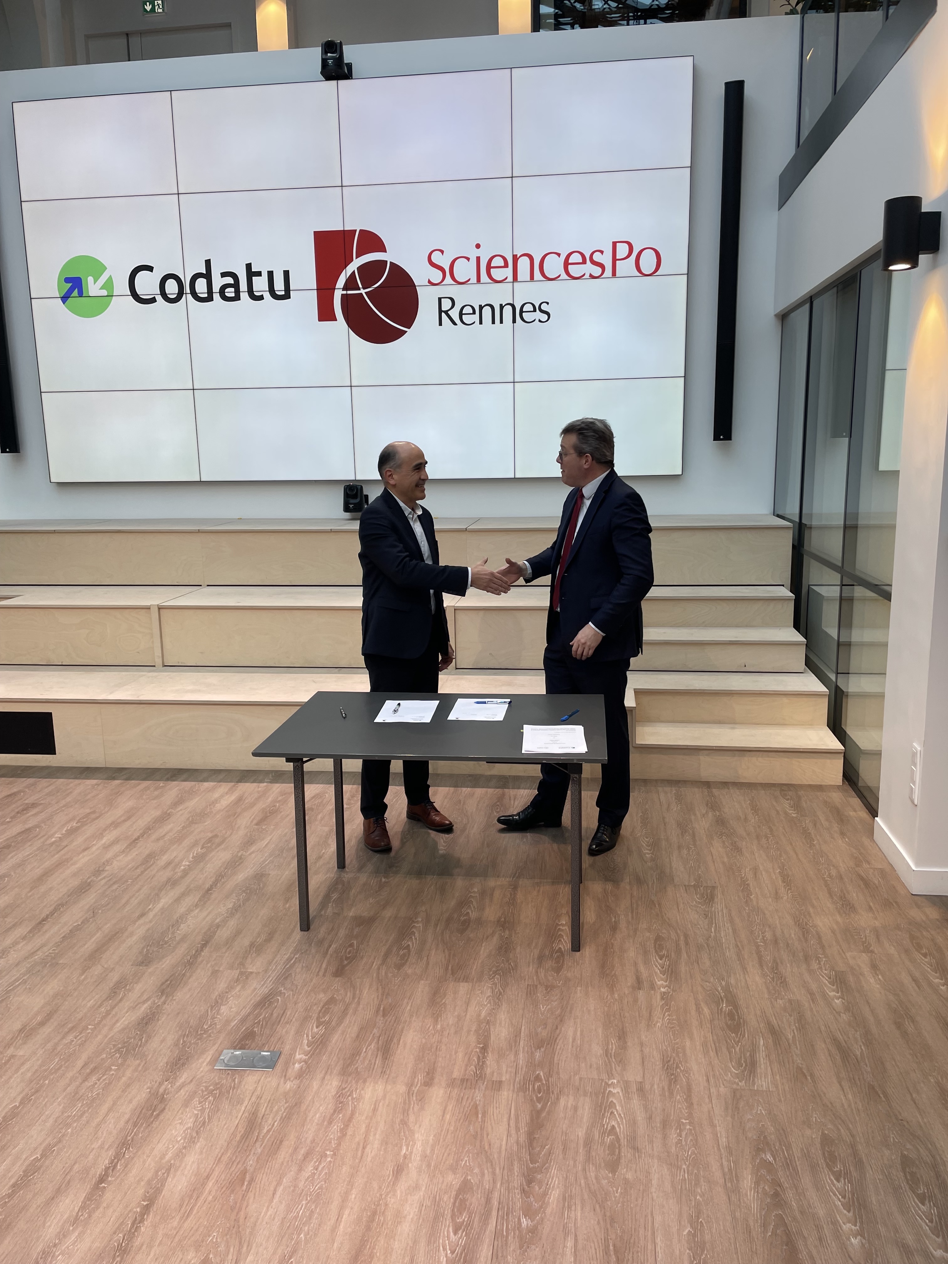 En signant à l’occasion des vœux de Codatu le 24 janvier 2024 la convention de partenariat avec Sciences Po Rennes, Francois Durovray, président de Codatu, et Pablo Diaz, directeur de Sciences Po Rennes, confirment l’engagement commun des deux institutions pour un développement des villes écologiques et inclusives dans le monde, fondées sur des mobilités durables.