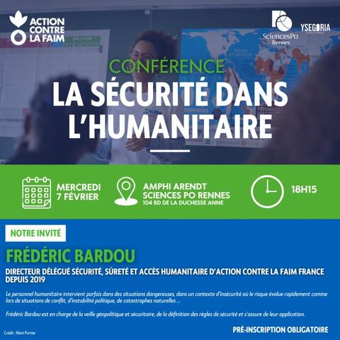 En partenariat avec l’association YSEGORIA, la Délégation Ille-et-Vilaine d’ACTION CONTRE LA FAIM organise à Sciences Po Rennes une conférence sur le thème : « La sécurité dans l’humanitaire » le 7 février prochain à partir de 18h15 en amphi Arendt.